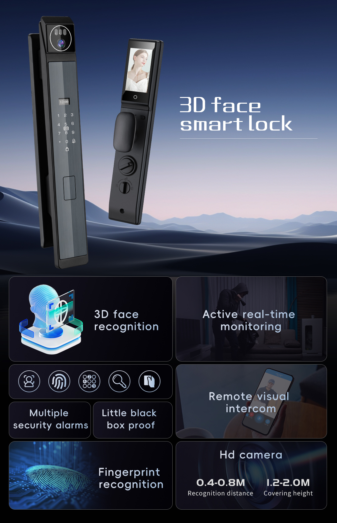 | Unlock Methods | 3D Face recognition, Tuya App, Password, Fingerprint, Card, Key, Video calling |