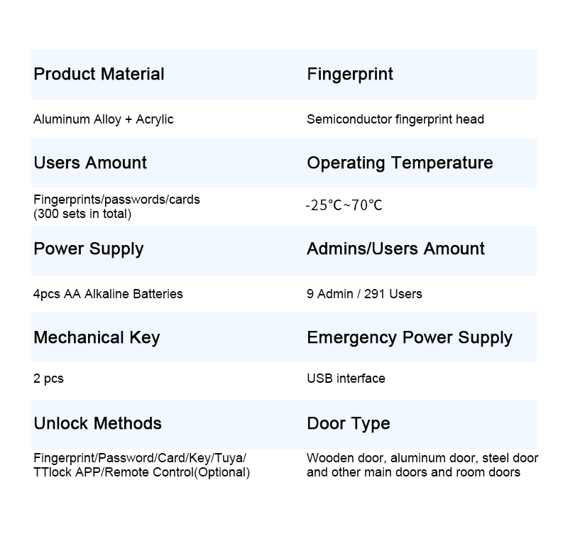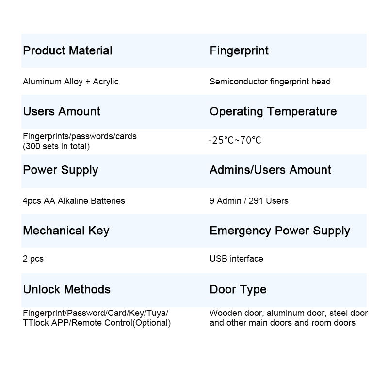 | 解錠方法 | Tuya WiFi/TTロックアプリ パスワード 指紋 カード 鍵 USBポート |
