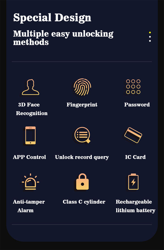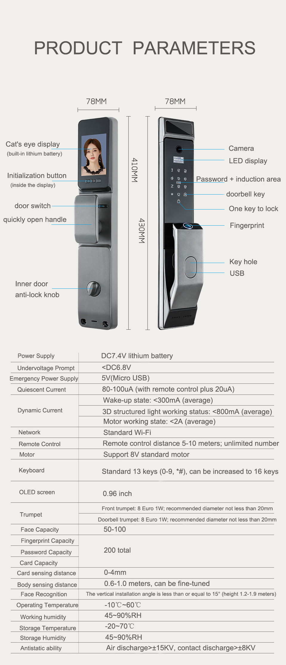 | ドアの厚さ: | 40~110mm | ロック解除方法: | Tuya wifi、パスワード、指紋、カード、キー |